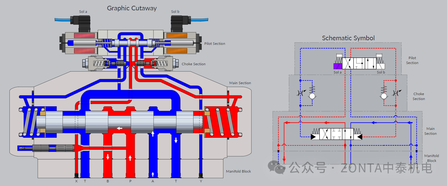 E型中位機(jī)能換向閥電磁鐵得電時(shí)的閥芯動(dòng)作