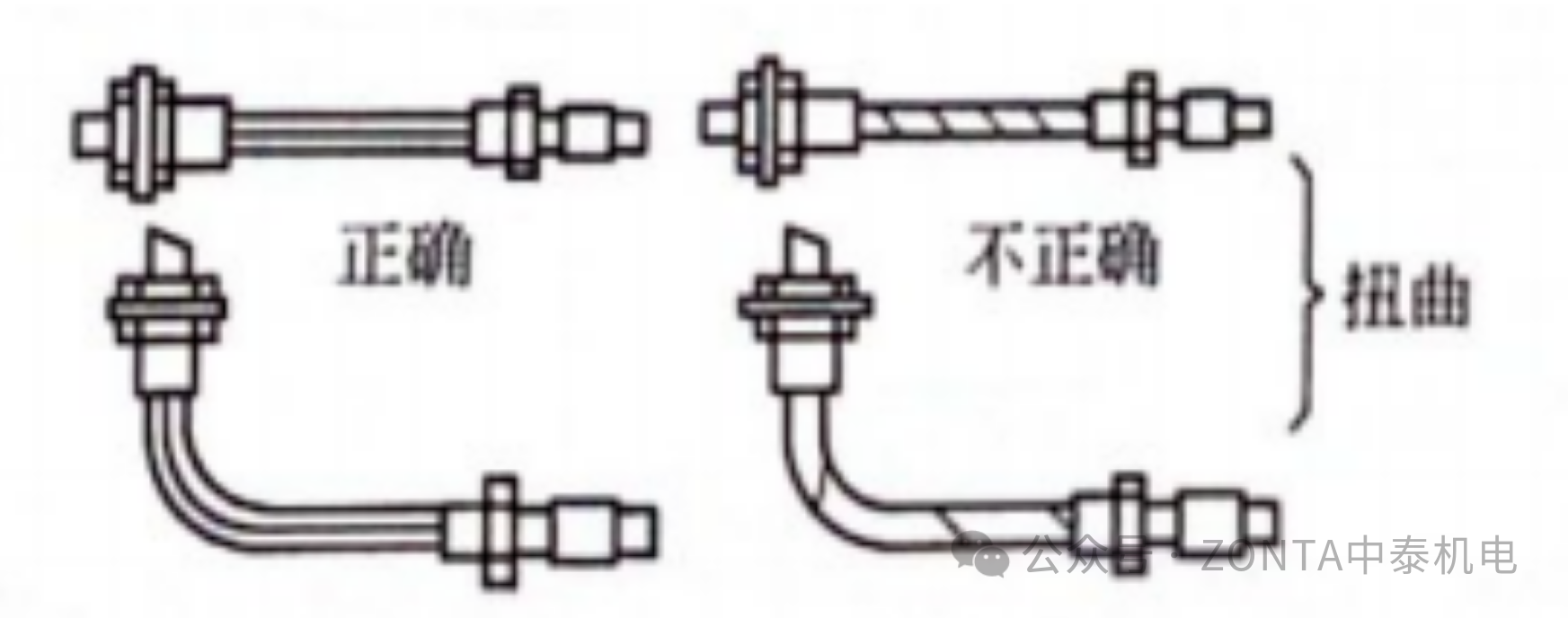 3、由于管子的彎曲角度不對(下圖a),以及接管長度不對(下圖b),管接頭擴(kuò)口處很難密合,造成泄漏。為保證不漏,應(yīng)使彎曲角度正確和控制接管長度適度(不能過長或過短)。