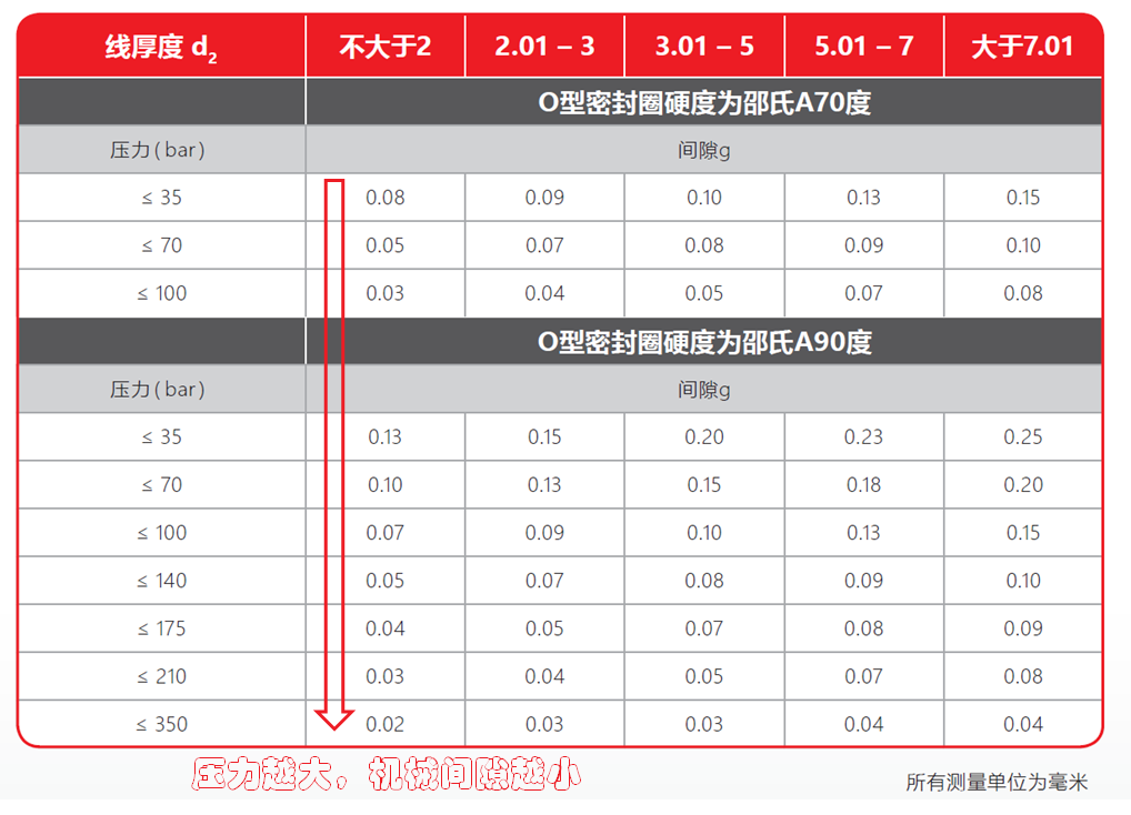 而機(jī)械間隙又取決于公差配合的選擇,加工工藝,裝配工藝等因素。除此之外,密封面間隙的壓力也是很關(guān)鍵的因素。下面給出O型圈線徑、所受壓力、機(jī)械間隙、硬度四者之間的關(guān)系表,可供設(shè)計(jì)時(shí)參考。粗略的看,總的設(shè)計(jì)原則就是——壓力越大,機(jī)械間隙就要越小。