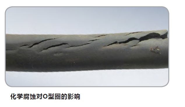 O型圈與化學(xué)物質(zhì)相接觸,導(dǎo)致彈性體交聯(lián)斷裂,彈性體硬化和脆化,最終失去彈性。