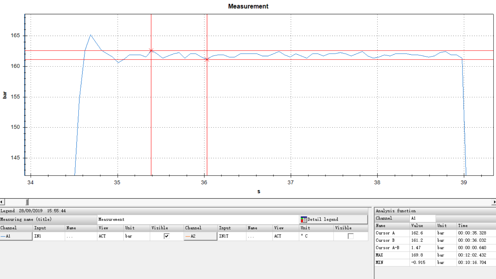 伺服驅(qū)動(dòng)葉片泵系統(tǒng),配合壓力傳感器和電機(jī)編碼器對(duì)系統(tǒng)壓力和電機(jī)轉(zhuǎn)速采集,運(yùn)用PID 算法,完成對(duì)系統(tǒng)的壓力和流量的雙閉合控 制。閉環(huán)控制使得開、合模、射膠位置、保壓位置、射退位置得以精確控制,使得保壓壓力實(shí)現(xiàn)穩(wěn)定控制。以下是T7DS E38(120.6cc)在162bar下的保壓測(cè)量值,從該圖表中可以看 出,系統(tǒng)過沖壓力為3bar左右,穩(wěn)定后壓力在 161.2-162.6bar之間,壓力波動(dòng)在+0.6~0.8bar。