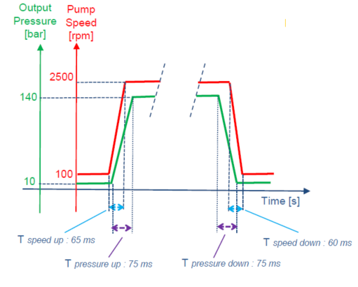 紅色曲線是速度閉環(huán)控制響應(yīng)曲線,綠色曲線為壓力閉環(huán)控制響應(yīng)曲線。為了防止氣穴現(xiàn)場(chǎng)發(fā)生,應(yīng)避免壓力上升和下降梯度超過極限 值,建議壓力上升梯度極限≤2500bar/s,下降 梯度極限≤3000bar/s。